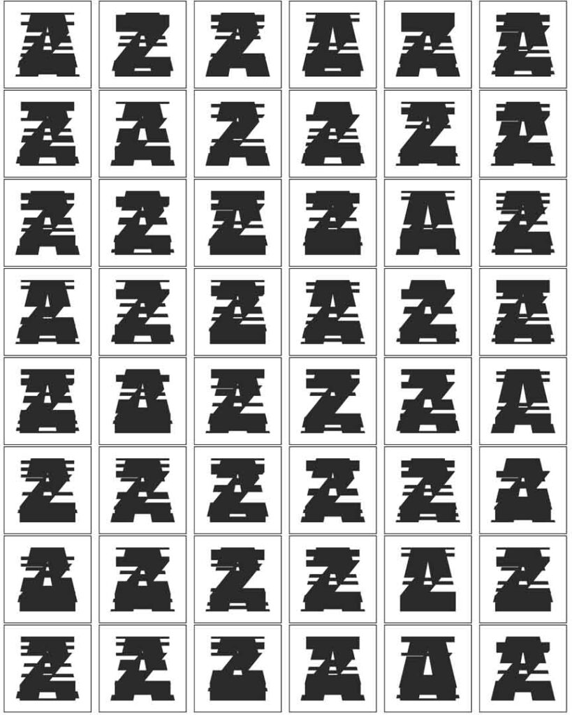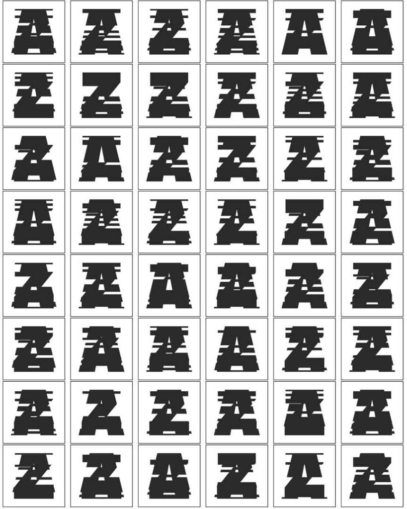 This project initially began with numbers, from 0 to 9, but here we briefly explored the letters ‘A’ and ‘Z’ to symbolise the bookends of the English language (A-Z). The intent was to deconstruct these bookends and, by extension, explore everything contained within the English-speaking world. However, the execution of this concept has not developed as intended.