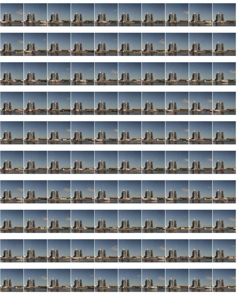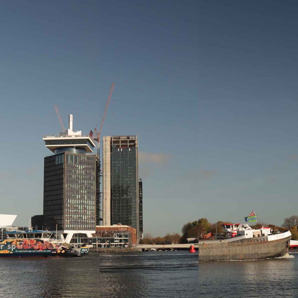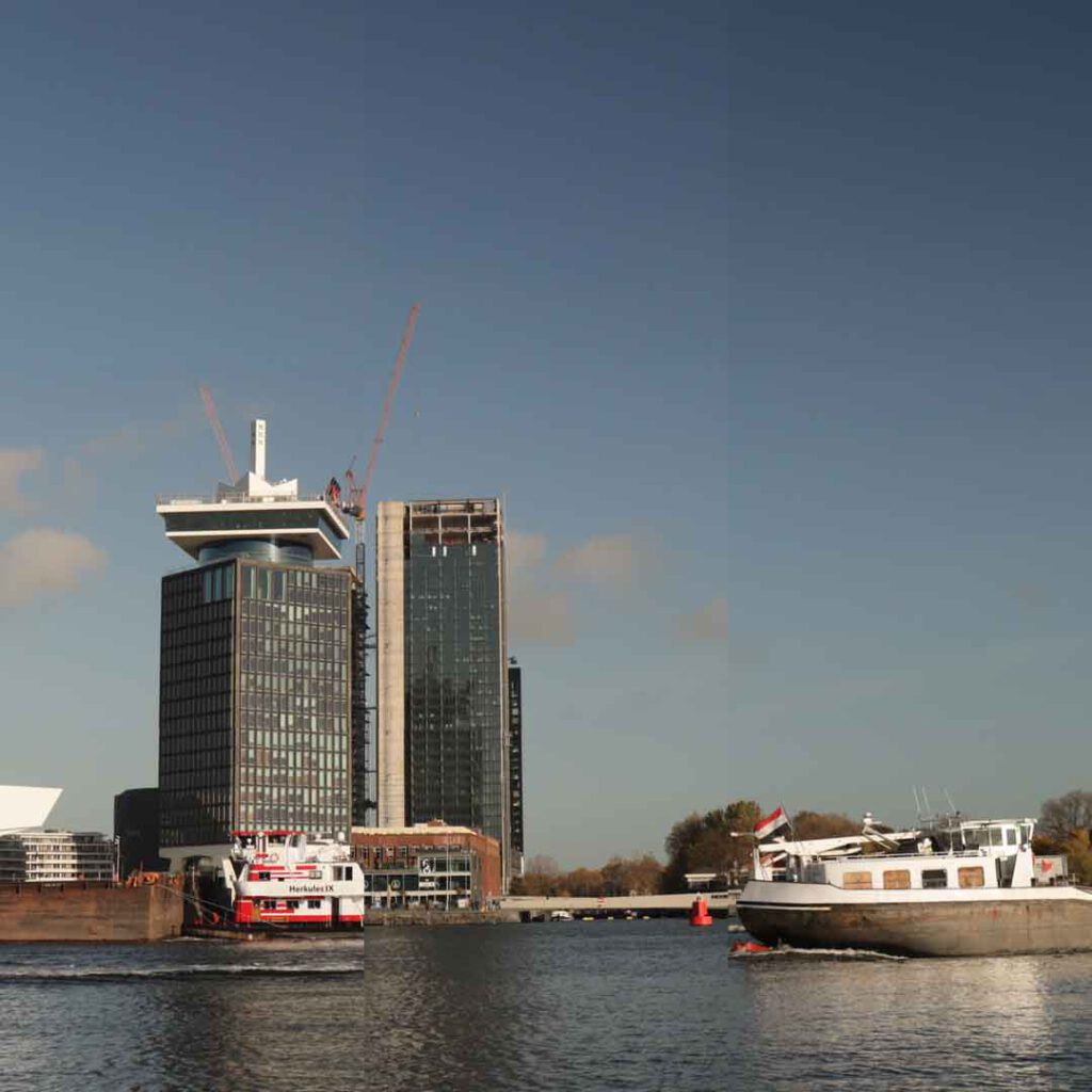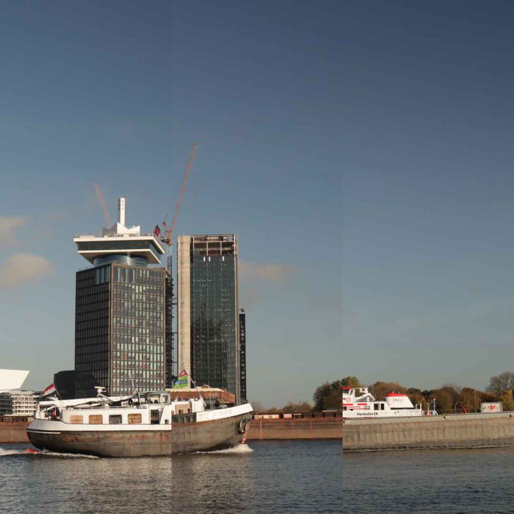 Returning to this project, we shifted our focus to the Adam Tower -the iconic modern building on the IJ waterfront in Amsterdam. Over a series of the day, we captured multiple images of the Ij and Tower from the same view point. These images were then broken down into smaller fragments and reassembled to create new compositions. The same process that we applied to the houses now transformed the Ij, revealing an abstract representation of the waterway and ever-changing relationship with its environment.
