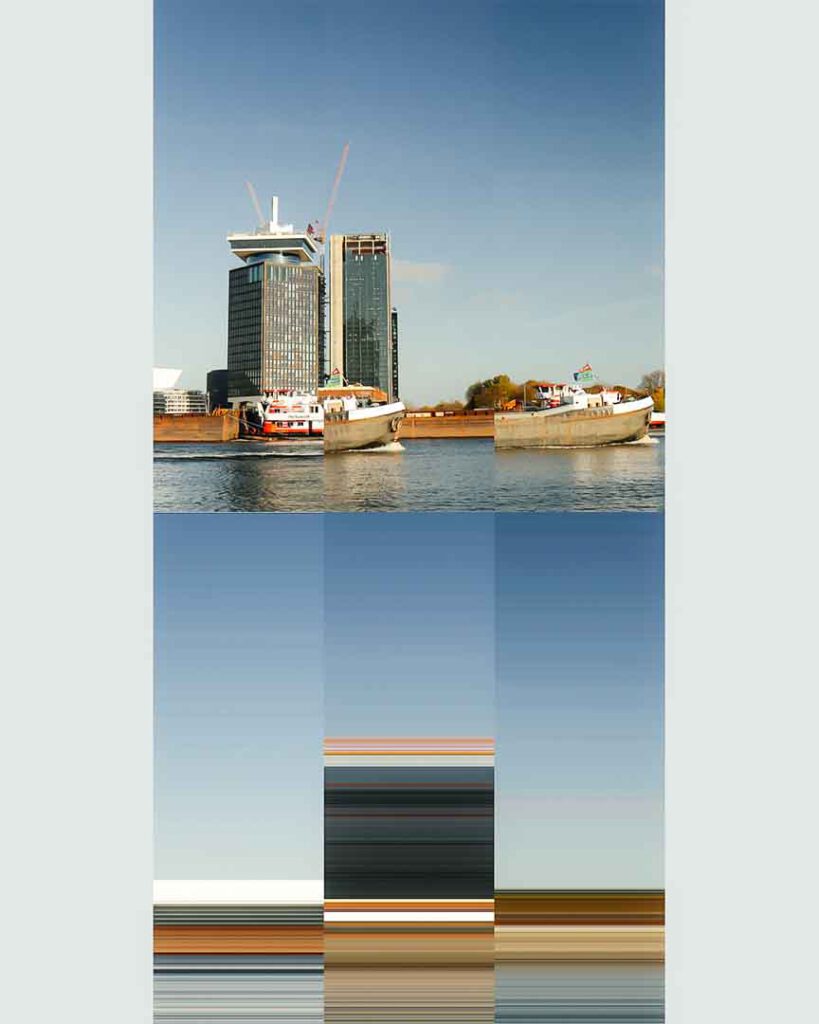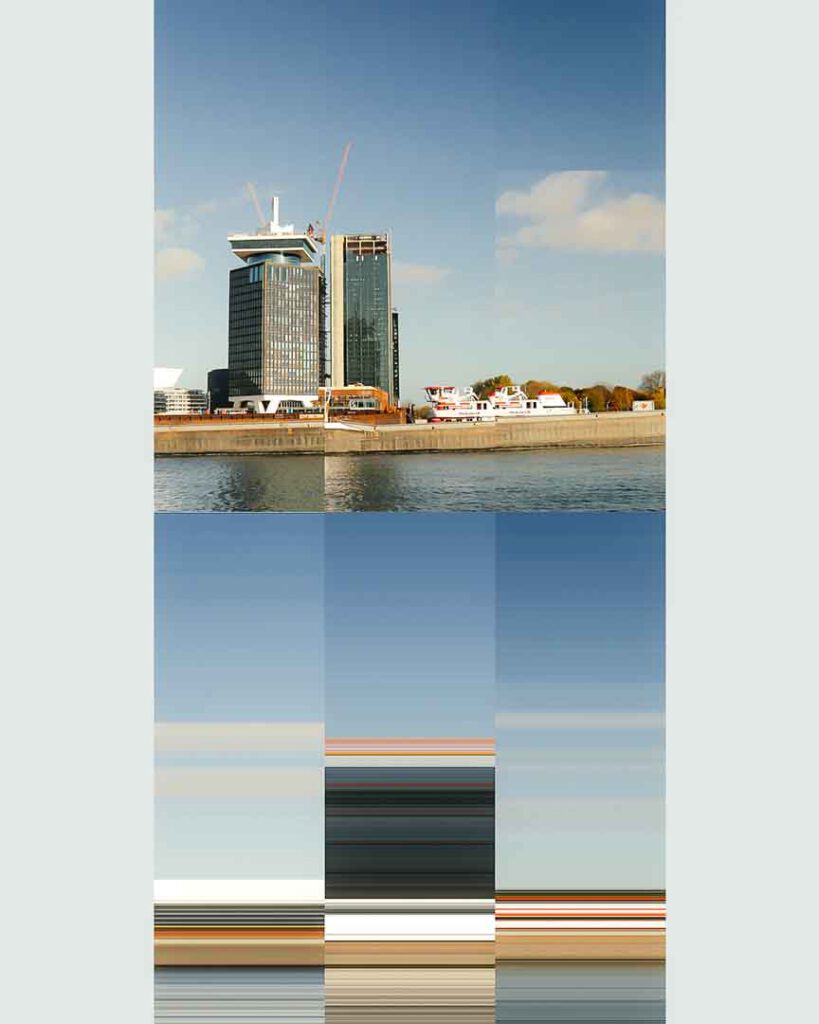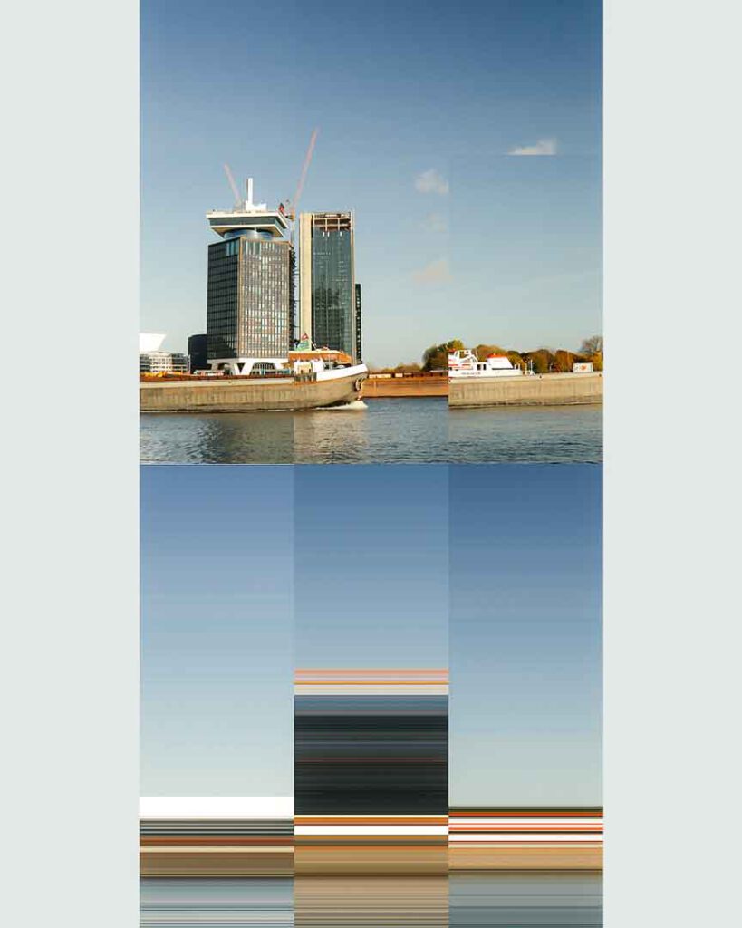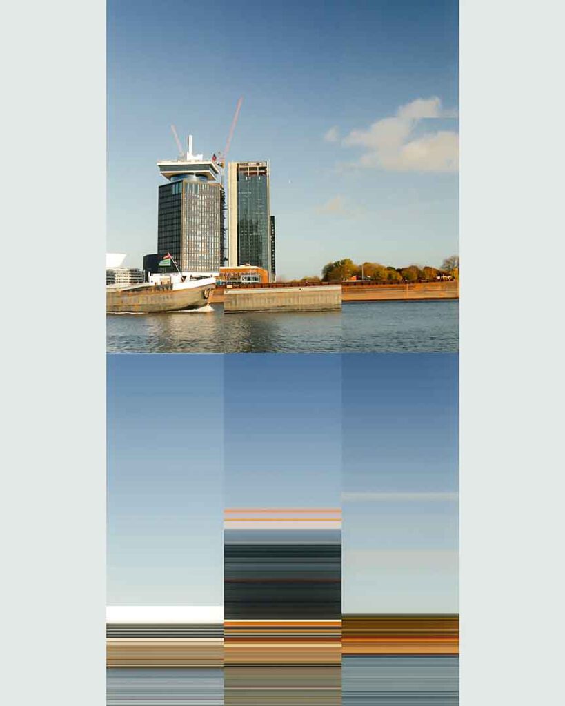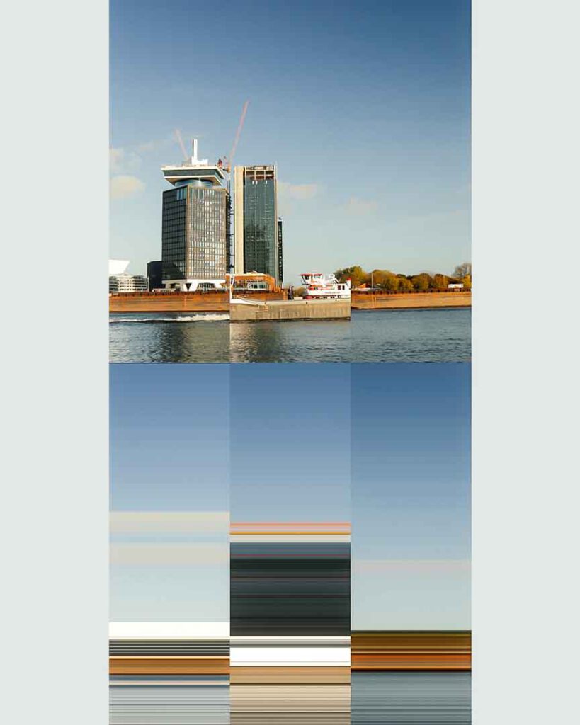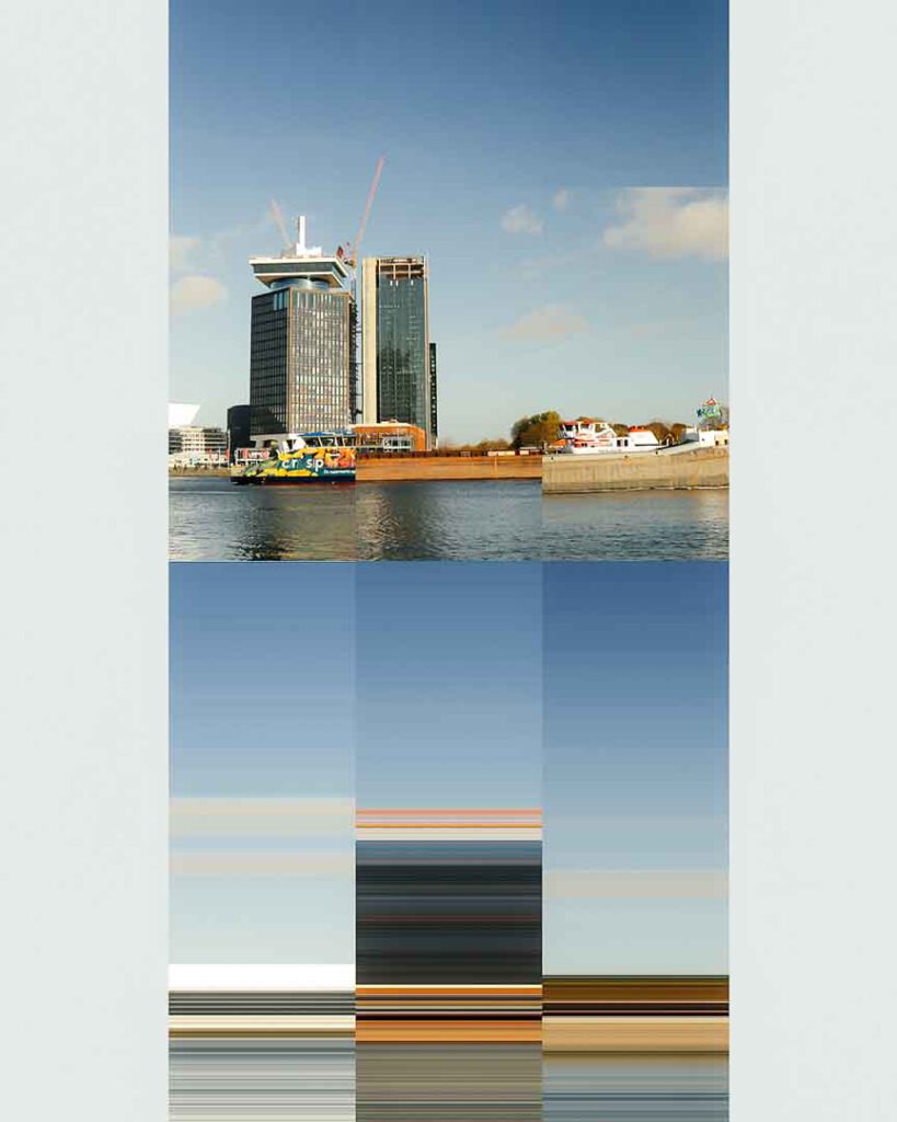 In this next stage of our exploration, we pushed the boundaries of our work with the iconic Adam Tower in Amsterdam by experimenting with pixel manipulation. Drawing inspiration from online examples of pixel-based art, we used the single pixel selector tool in Photoshop to create a new layer of abstraction. By selecting a single row of pixels-either horizontally or vertically-from our reconstructed images, we extended these lines across the canvas, resulting in streaks of colour and texture.